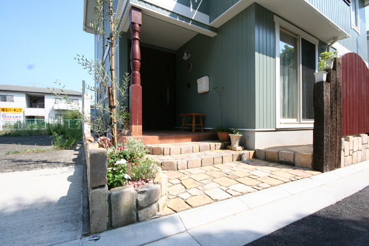 優しい素焼きの色が、モスグリーンの家に良く合ってます。